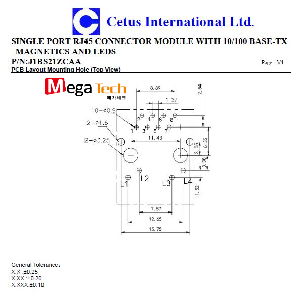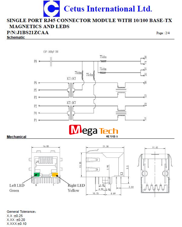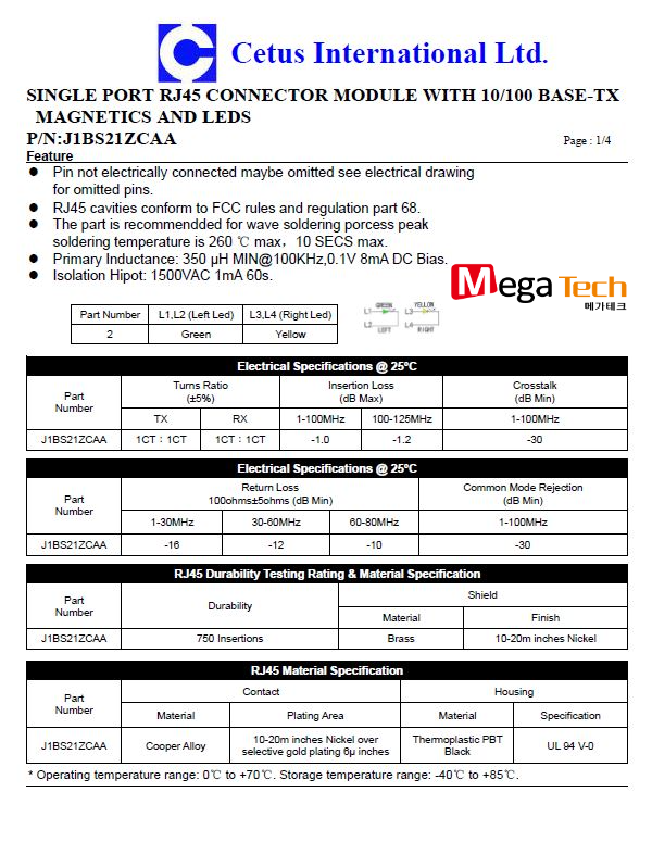 제품간략설명 : SINGLE PORT RJ45 CONNECTOR MODULE WITH 10/100 BASE-TX MAGNETICS AND LEDS